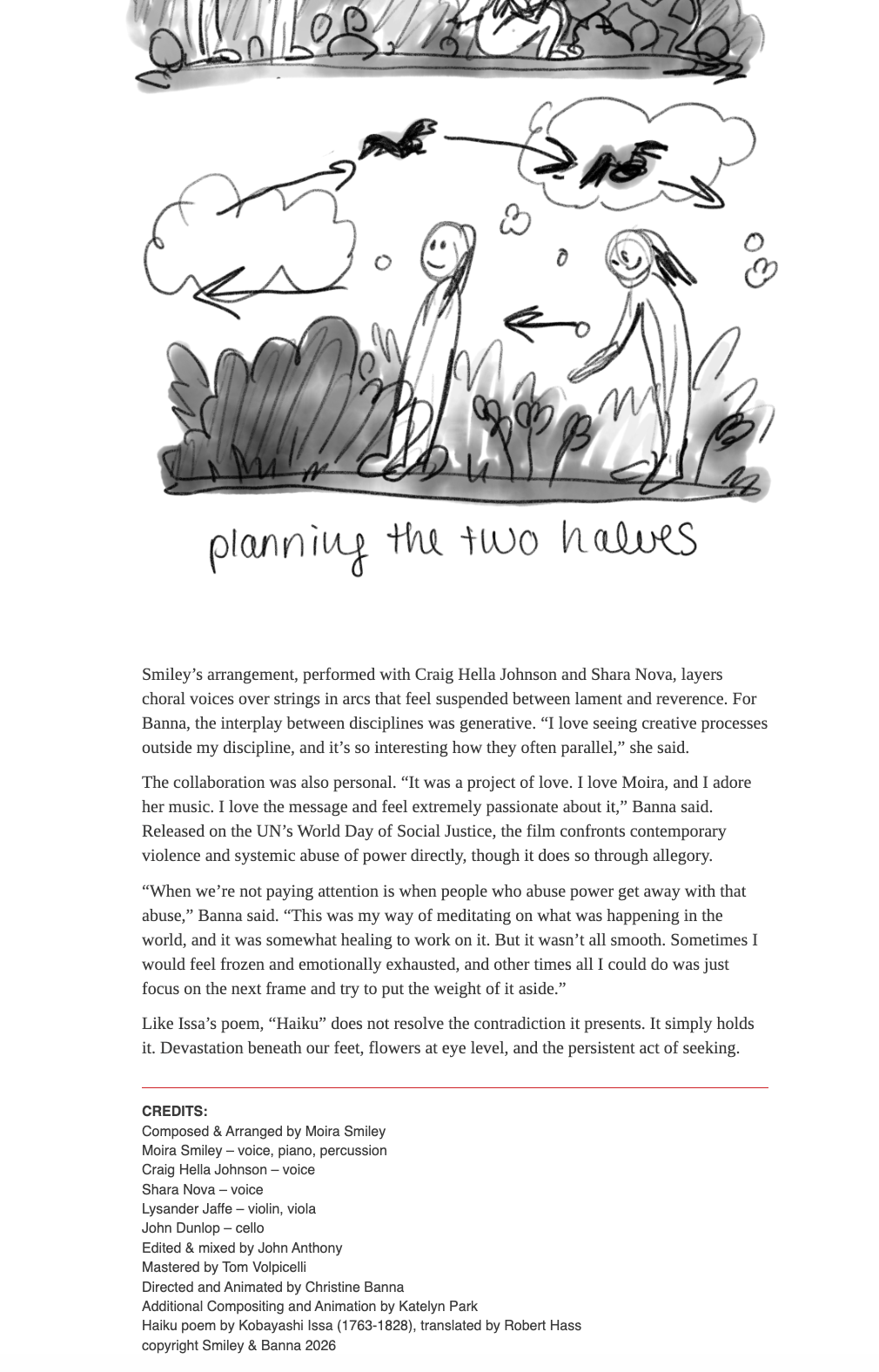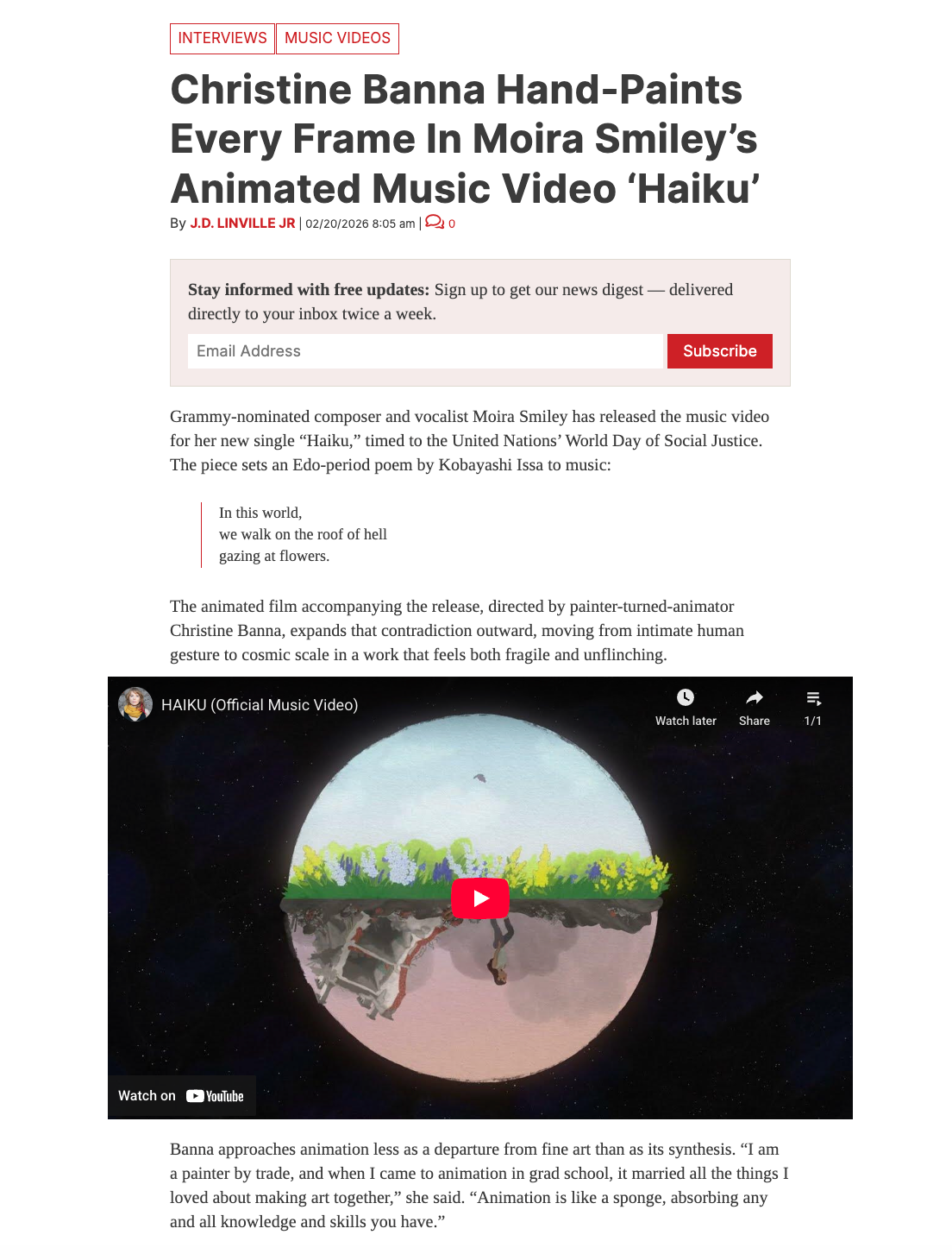 “Christine Banna Hand-Paints Every Frame In Moira Smiley’s Animated Music Video ‘Haiku’” By JD Linville Jr. February 20, 2026