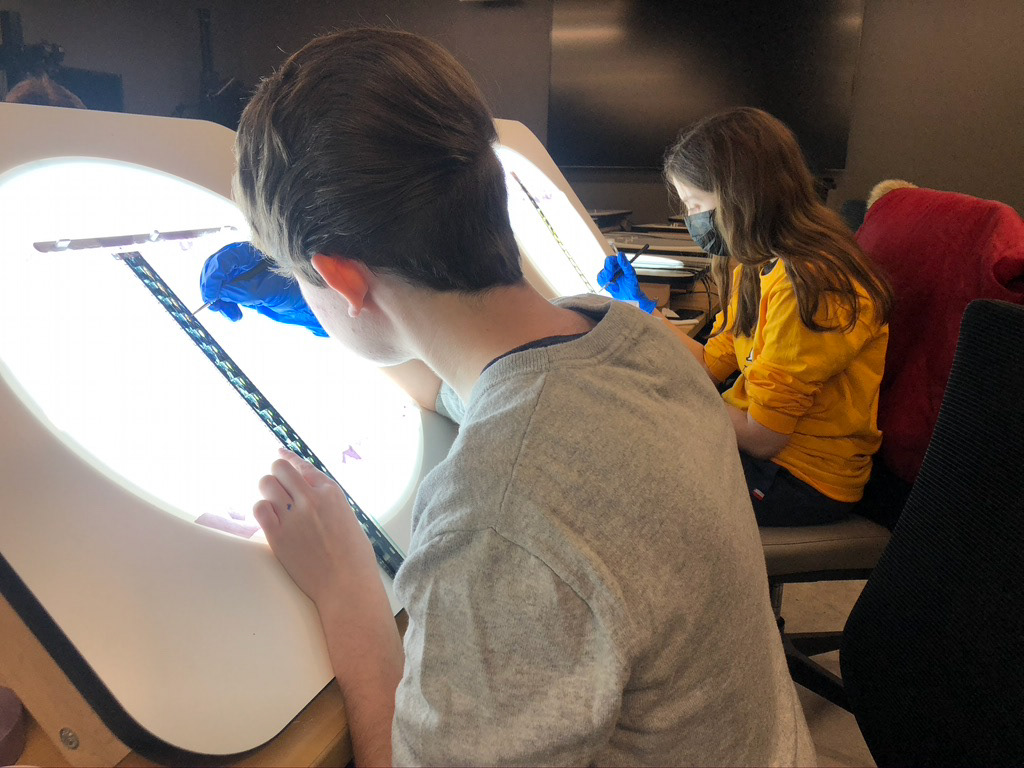My two interns Ren and Amanda hard at work manipulating found footage on 35mm film
