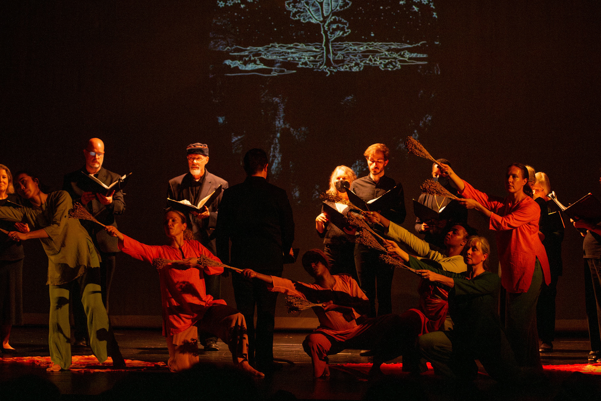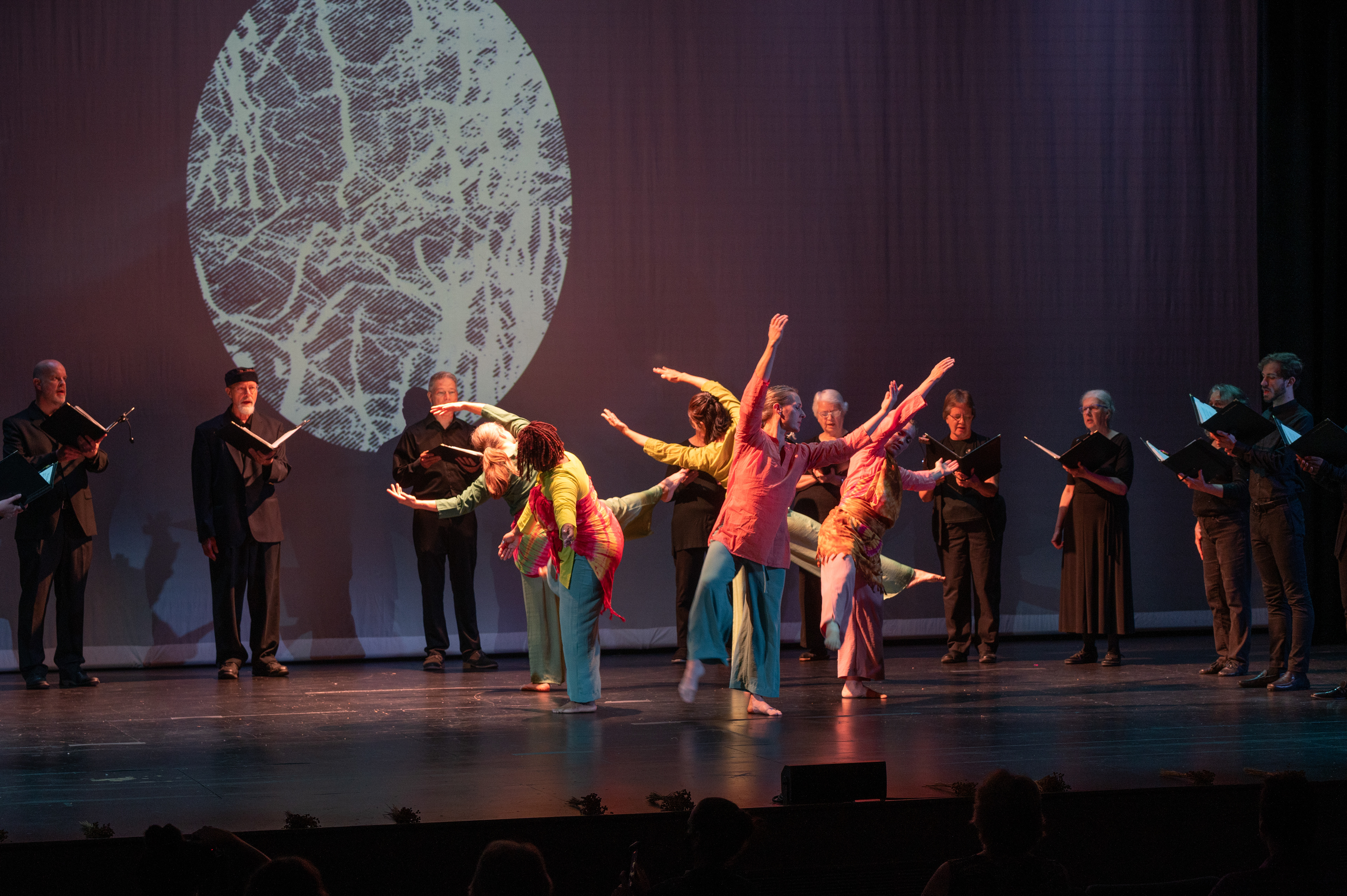 "Stories From the Living Tree is an immersive experience of song, dance, sound, and animation, centered around an ancient tree. This tree, a source of great wisdom, extends through its roots and canopy to all corners of the earth, and beyond the earth into the spiritual realm and across time. The performers will gather at the tree to share stories of universal experience and a reverent connection to nature. These stories will be told through the singing voice, in a multitude of languages and from a variety of cultural perspectives, through the solo and collective movement of the dancers’ bodies, through ambient and transitional sound, through the abstracted visual projection of plants and other life forms, and also through the movement of our ASL interpreters’ hands.